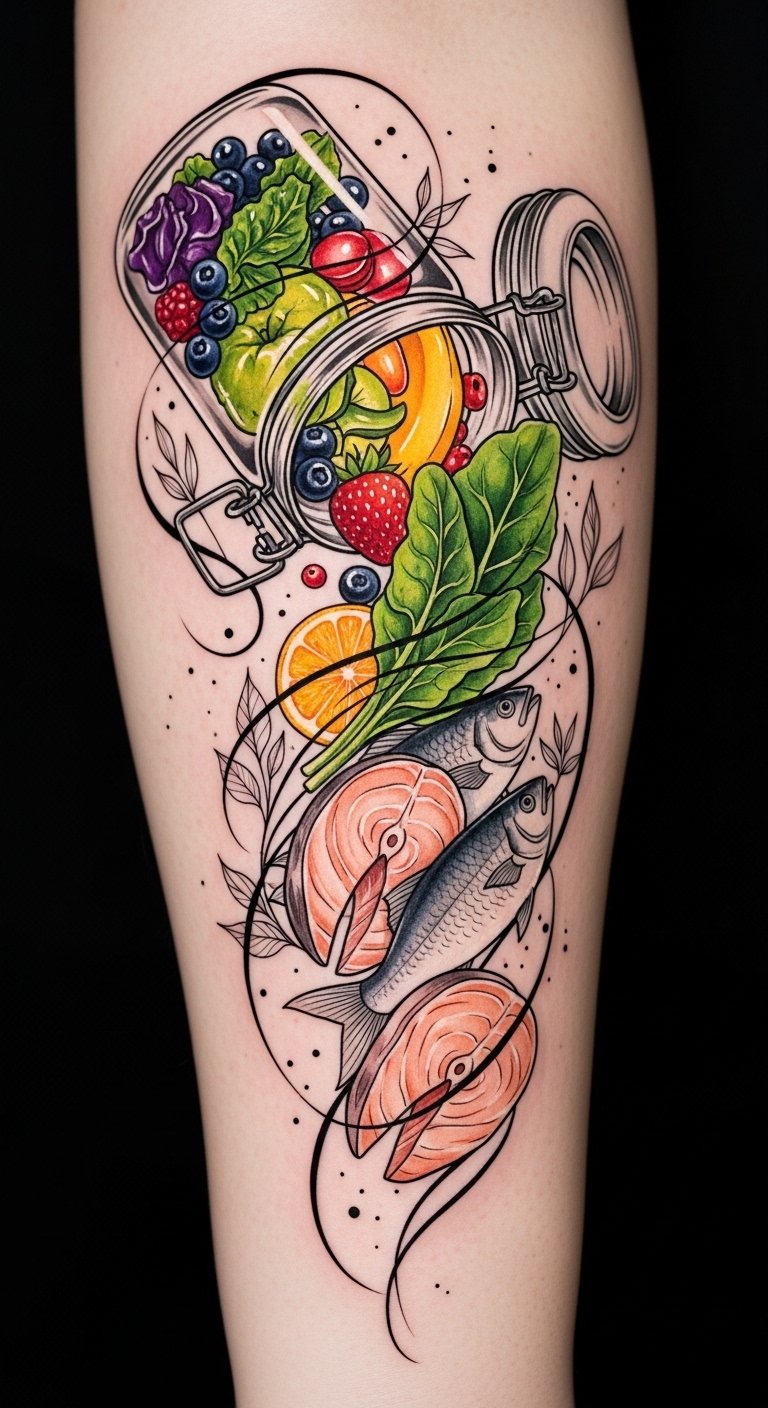 The fruits and leafy greens convey vibrancy and healing, while the stylized lean protein forms anchor the composition, reflecting balance and strength.