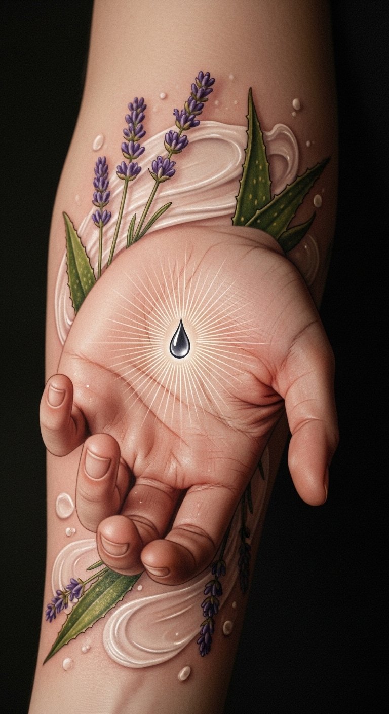 The design symbolizes ongoing care and reverence for healed skin: the hand cradles the glowing ink drop to express protection and nourishment, while the botanicals (lavender and aloe) represent soothing, natural healing and moisturization.