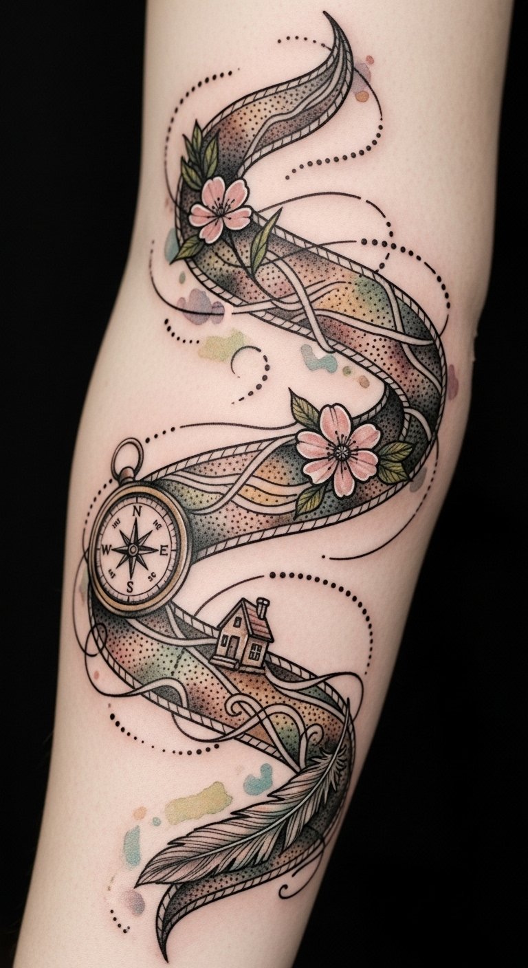 The design symbolizes life as an interconnected tapestry—threads representing time and choices, the compass for direction, the blossom for growth, the house for roots, and the feather for freedom—evoking introspection and calm confidence; places well on the forearm for visibility and storytelling or the back shoulder for a more private, graceful display where the band follows muscle contours and breathes with movement.