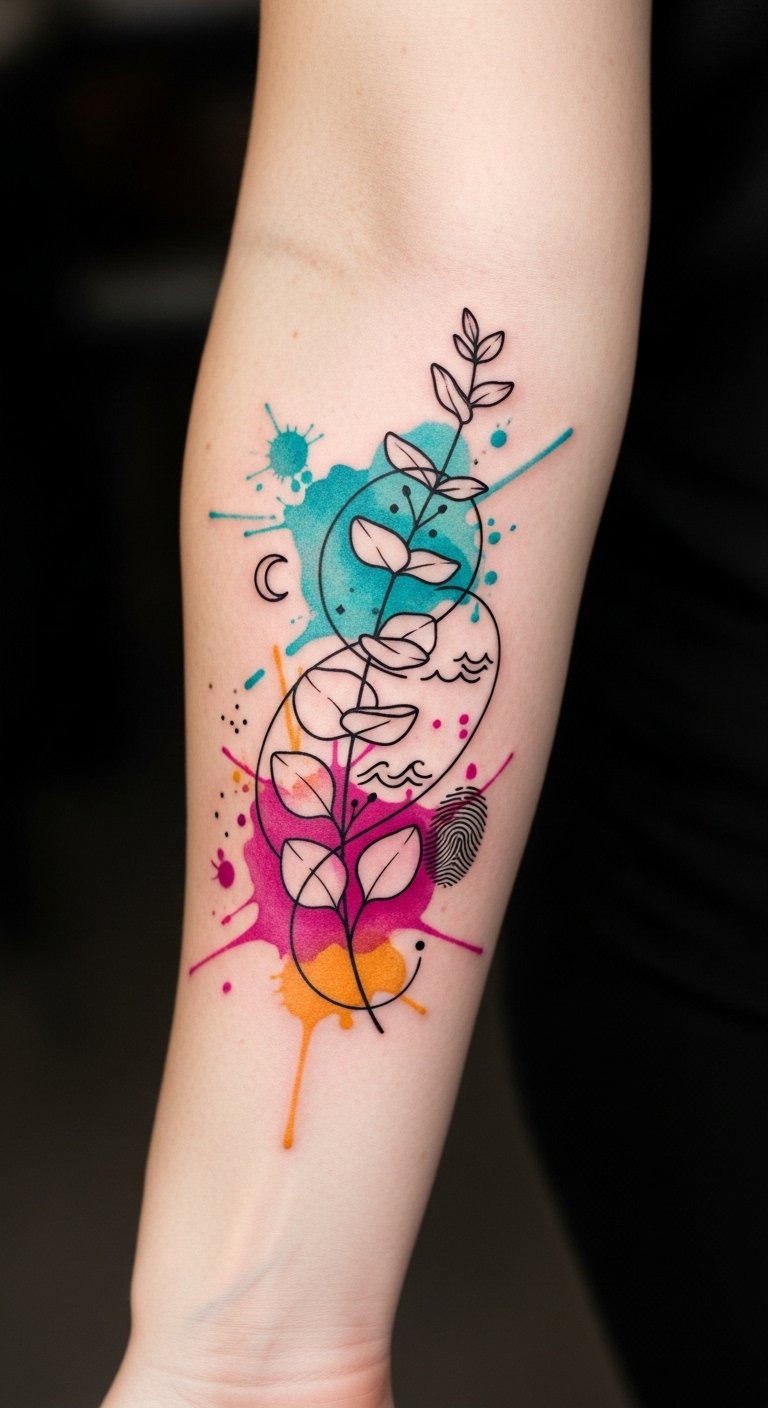The sprig of eucalyptus symbolizes resilience and healing, the watercolor splashes represent emotional vibrancy and the role of color theory in harmony, and the tiny cultural motifs and fingerprint center the design in personal narrative and shared heritage; placed along the forearm, the piece feels intimate yet visible, curving naturally with musculature to invite touch and conversation while balancing boldness and subtlety.