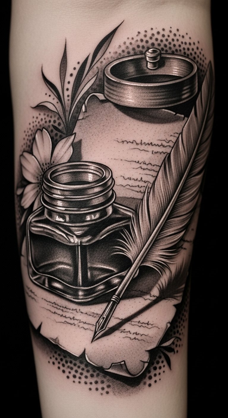 This design symbolizes the craft of creation and the permanence of artistic expression; the inkwell and quill evoke the artist’s hand while the soft floral shading represents growth and subtle beauty.
