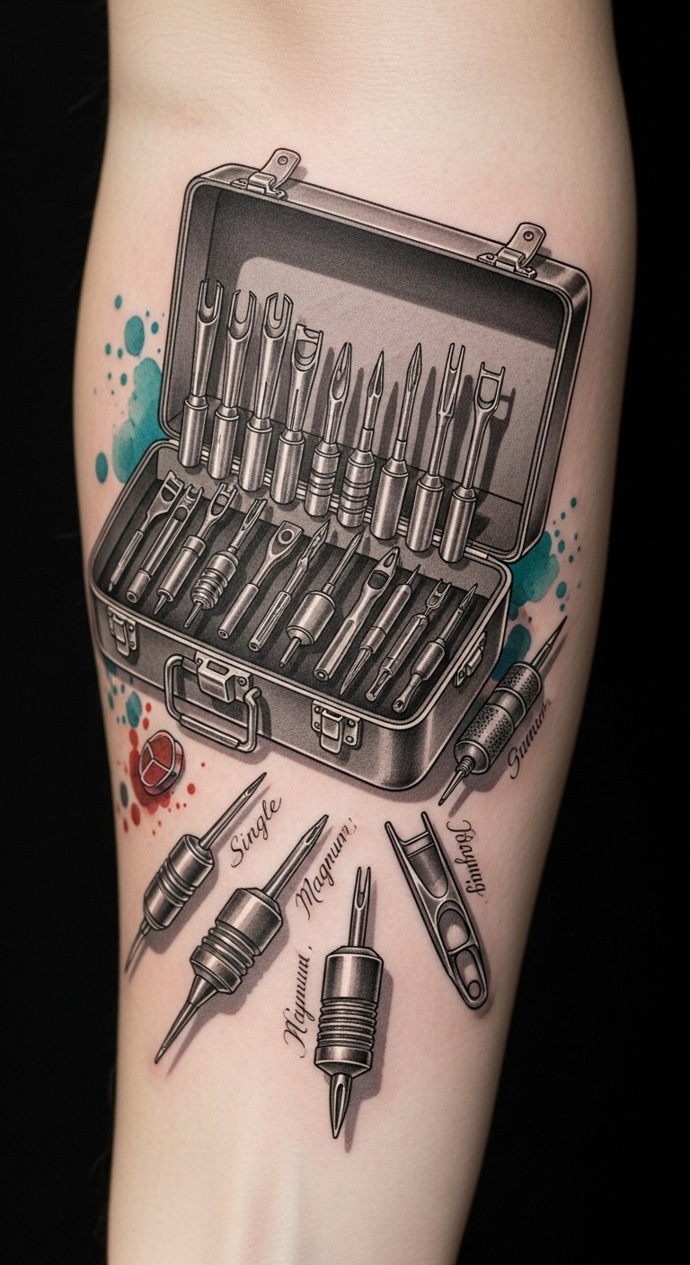 Emotionally it conveys confidence, curiosity, and respect for the tools that refine skill. Ideal placement is the inner forearm so the toolbox follows the arm’s line, allowing the artist and viewer to study the needles’ details up close and to reflect on personal growth and decision-making in creative practice.