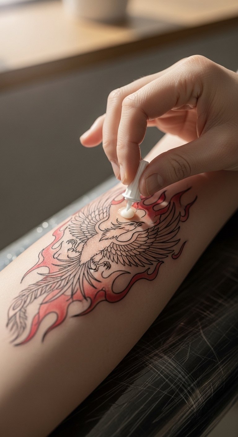 Emotionally, the piece balances resilience and tenderness—strength in the phoenix’s rise, gentleness in the act of aftercare. Ideal placement is on the inner forearm where visibility allows both artist and wearer to witness healing, and where the size accommodates detailed linework and the subtle gloss that highlights the ointment’s protective role.