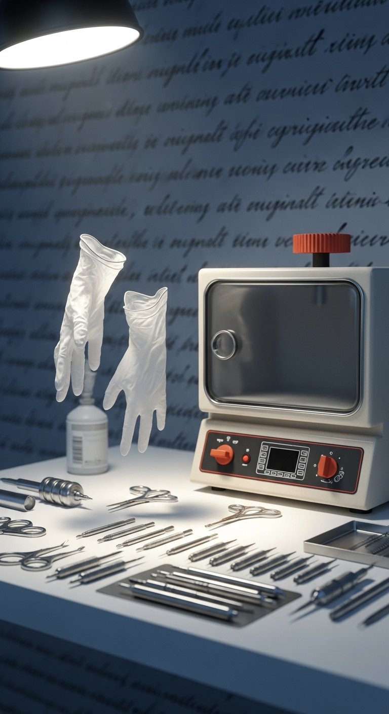 This design symbolizes professionalism and care: the sterilizer and tools represent safety standards, the suspended gloves evoke a moment of readiness, and the faint script ties the image back to guiding principles.