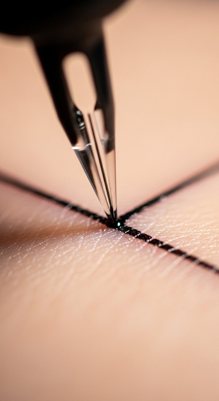 The design concept frames the needle and hand as both tool and extension of the artist’s intent, symbolizing discipline, care, and creative control. Emotionally it conveys meticulous focus and quiet confidence—an intimate moment where technique meets expression.