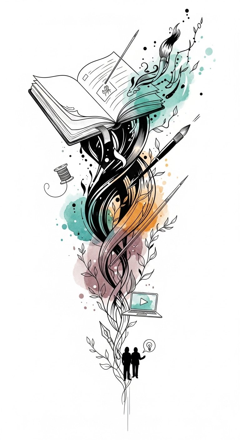 This design symbolizes the ongoing evolution of craft — the open sketchbook represents foundational technique, the flowing ink and paint strokes express continual growth and creative momentum, and the climbing vines embody perseverance and expansion.