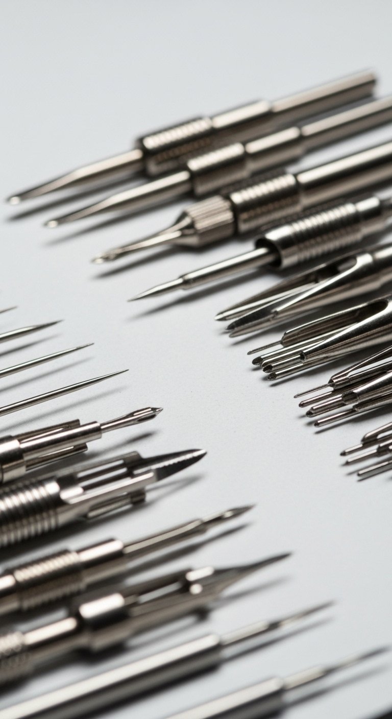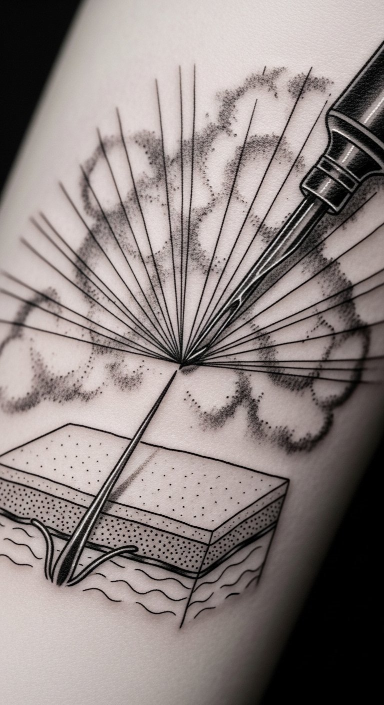 A tattoo design concept built around the technical guidance of the original text: a stylized forearm sleeve that visually represents needle types and gauges—fine-line botanical elements rendered with thin, single-needle precision, transitioning into bold, shaded geometric shapes using thicker multi-needle configurations; integrated instructional motifs like subtle gauge markings and schematic needle silhouettes. Symbolically, the piece balances delicacy and strength, reflecting the emotional duality of vulnerability and confidence; placement on the forearm allows the wearer to display both the artistry and the deliberate technical choice, while the flow of the design follows muscle lines to emphasize control and precision.