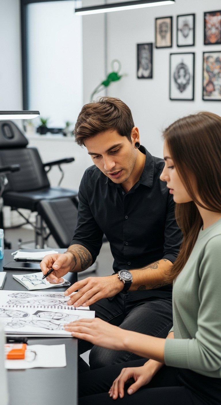 While it’s easy to get caught up in the excitement of choosing a tattoo, you shouldn’t overlook the importance of discussing design and placement with your artist. Clearly communicate your design preferences, including style and size, while considering placement considerations like skin type and body contours. This collaboration guarantees your vision translates accurately, minimizing the risk of blowouts and enhancing the overall outcome. The concept uses a balanced composition: a flowing organic motif that follows natural body contours—vine-like linework that tapers and widens to suit curves, combined with crisp fine-line details to prevent blowout risk. Symbolically it represents intentionality and trust between client and artist, evoking calm confidence; place along the outer forearm or ribcage where movement and skin texture complement the design and allow for scalable size adjustments.