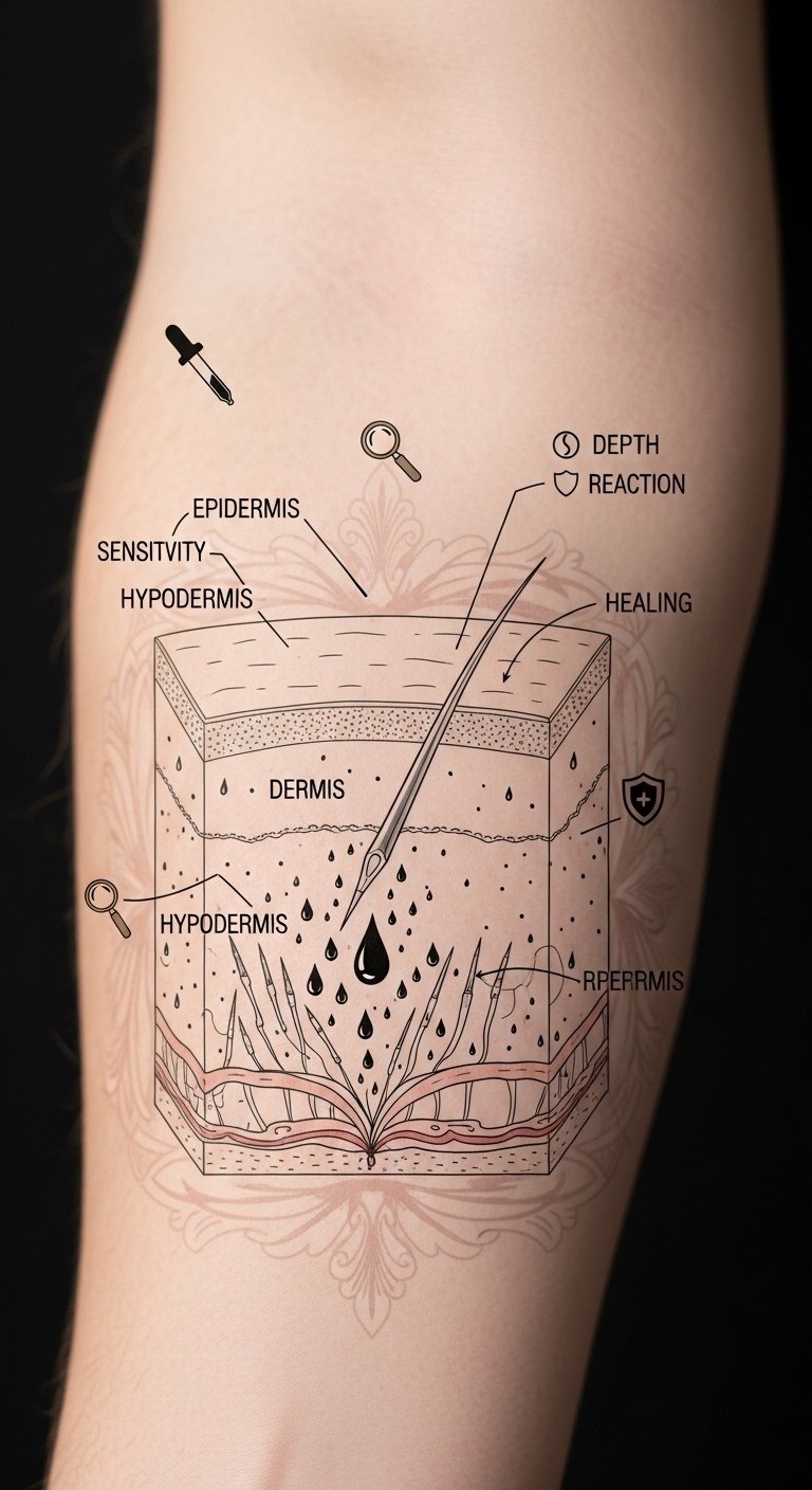The design translates the practical guidance about skin sensitivity into a visual narrative: the skin cross-section and embedded ink droplets symbolize the technical interplay between needle depth and pigment, while the diagnostic icons and callouts evoke testing, observation, and prevention.
