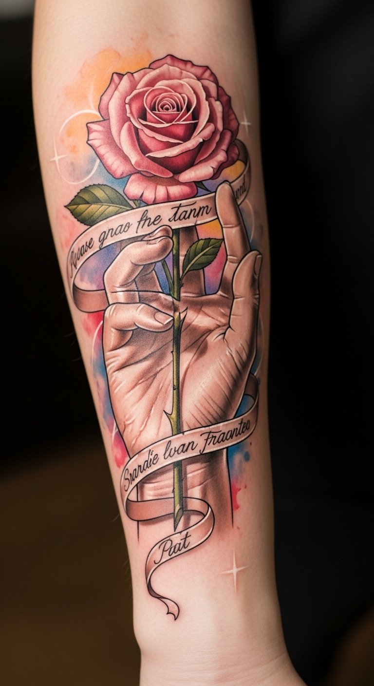 Warm watercolor tones evoke comfort and gentle healing, the subtle healing sheen and scarring detail convey realism and the emotional commitment involved in caring for one’s body. Ideal placement is the outer forearm where the horizontal composition wraps naturally, allowing easy visibility for daily reminders and sufficient skin area for fine text and detailed linework.