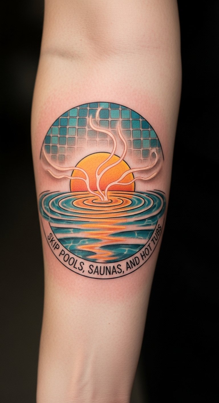 The design juxtaposes water and heat to mirror the text’s warning: the cooling, controlled geometry of pool tiles and gentle ripples represents careful healing, while the warm, swelling sun and steam visually communicate the risks of excessive heat. Placing this on the forearm keeps the message visible to the wearer during aftercare, offering a calming reminder to prioritize the tattoo’s integrity and vibrancy. The integrated phrase serves both as instruction and as a personal mantra, blending practicality with protective intention.