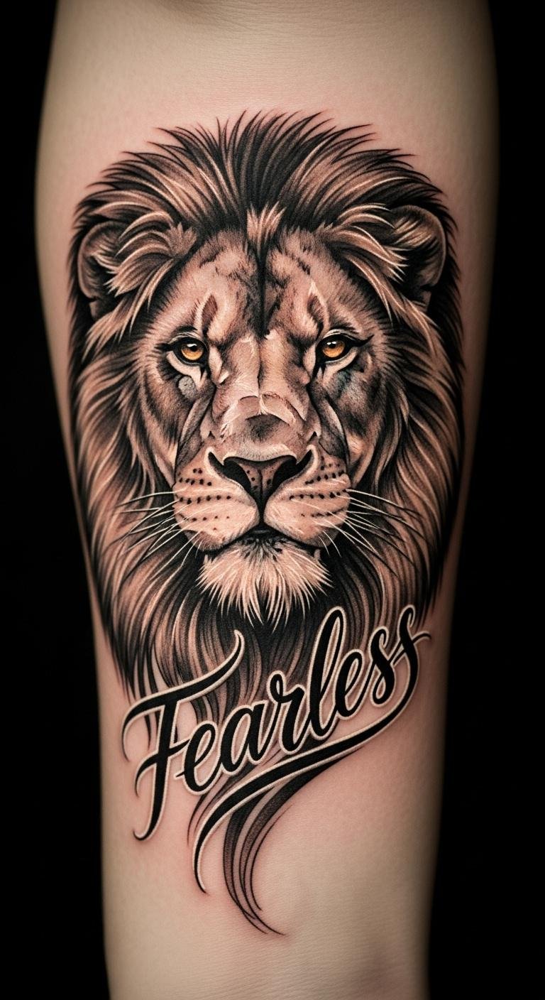 Imagine a lion head embodying courage, its fierce gaze complemented by the word “fearless” in a bold script.