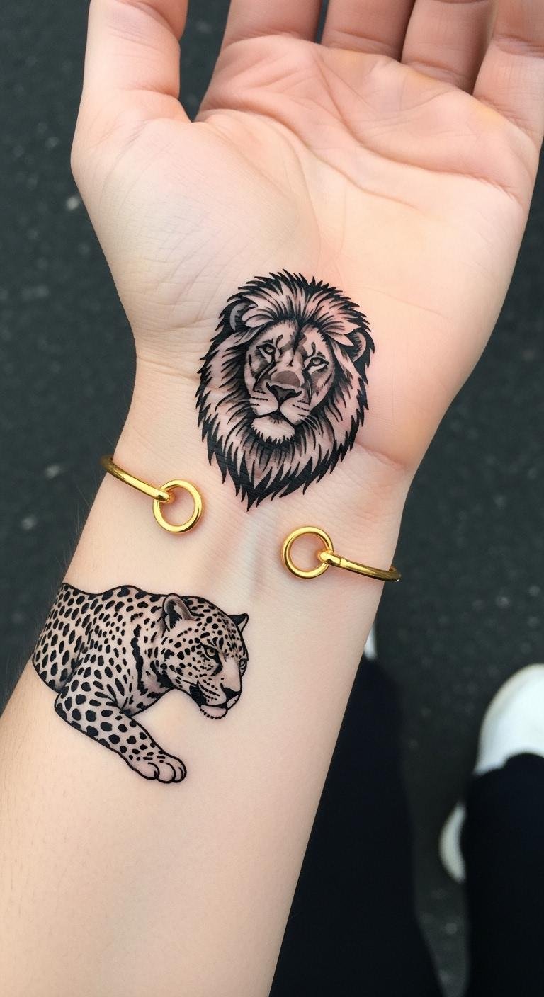 These standalone animal designs evoke strength and personal identity, channeling courage through the lion and relentless drive through the leopard; placed on the inner or outer wrist they offer a private reminder of resilience and autonomy, the compact composition allowing for clean lines or subtle shading to match emotional intensity while maintaining a bold, wearable statement.