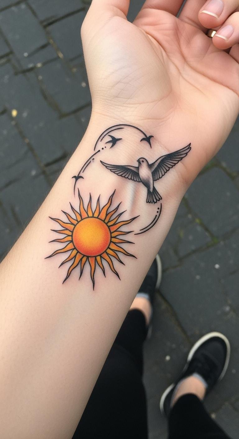 The radiant combination of sun and bird tattoos captures the essence of freedom and energy, making them a stunning choice for wrist art. With sun symbolism reflecting warmth and liveliness, and the bird embodying freedom, this design celebrates your spirit. Perfectly placed on your wrist, it serves as a daily reminder to soar high and embrace life’s limitless possibilities.
