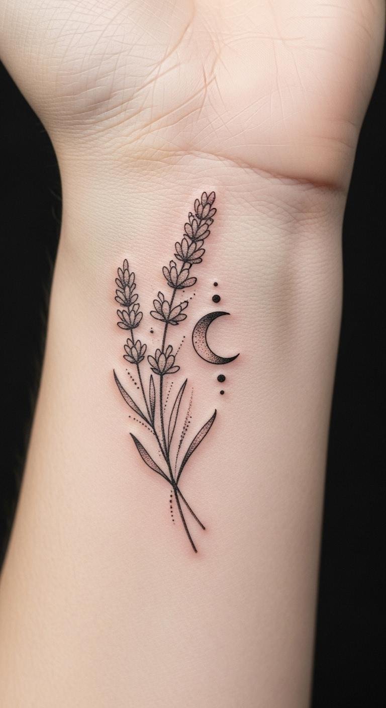 The lavender sprig symbolizes calm, healing, and grace, while the crescent moon adds intuition and feminine cycles; together the composition evokes quiet resilience and inner balance.