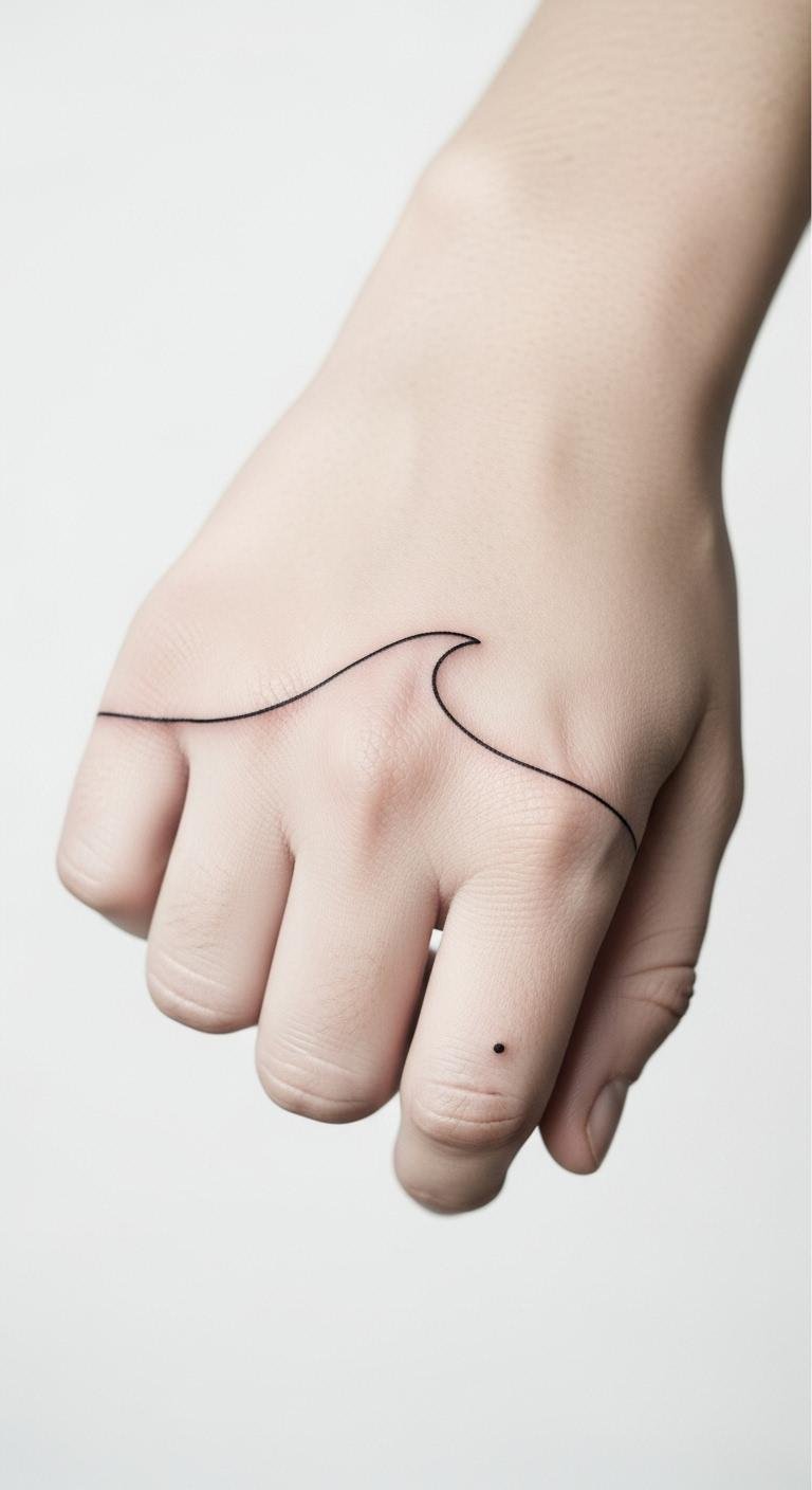 Embrace a minimalist design that resonates with your spirit, celebrating your uniqueness while remaining effortlessly chic. Let your hands tell your story. The abstract wave line evokes flow and continuity—movement through challenges and moments of calm—while the tiny dot marks a personal anchor or intention; placed along the knuckles it reads as both intimate and public, a wearable reminder on a highly visible plane, conveying quiet confidence and emotional steadiness.