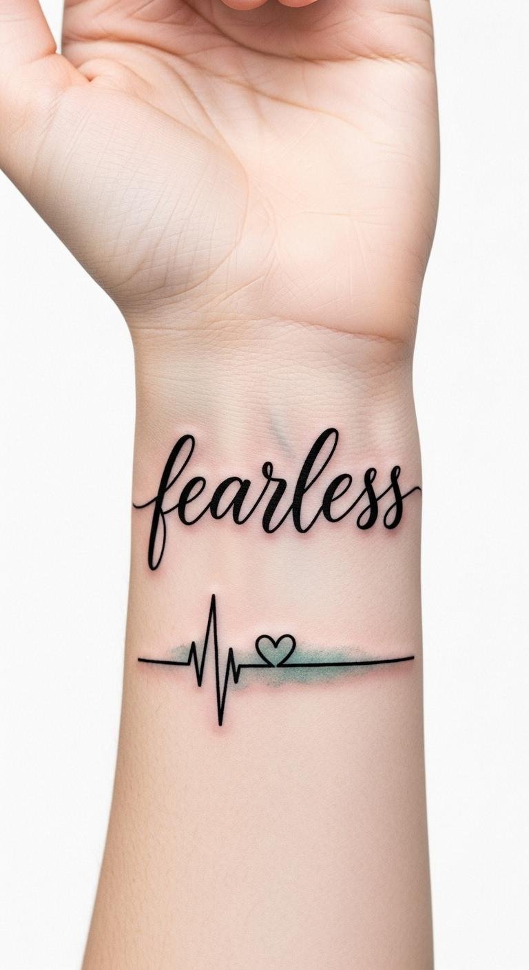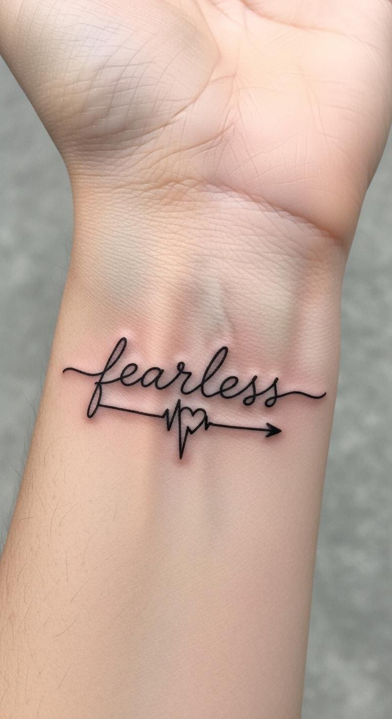 This design places the quoted text as a narrow horizontal wrist tattoo in a clean sans-serif or delicate cursive, thin black ink, with generous letter spacing and subtle negative space accents between key words (e.g., “fearless” slightly bolder). Symbolically, the minimal lines and restraint convey quiet confidence and inner resilience; emotionally it reads as a calm, continual affirmation rather than loud declaration. Placement on the inner wrist makes it personal and visible to the wearer, serving as an everyday tactile reminder of strength while remaining elegant and understated to observers.