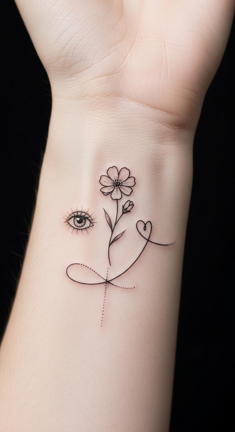 This composition blends watchful awareness (the open eye), growth and resilience (the wildflower), and intimate self-love (the looping heart), evoking quiet confidence and gentle protection; its inner-wrist placement keeps it personal and easily seen, encouraging mindful moments each time it’s glimpsed.