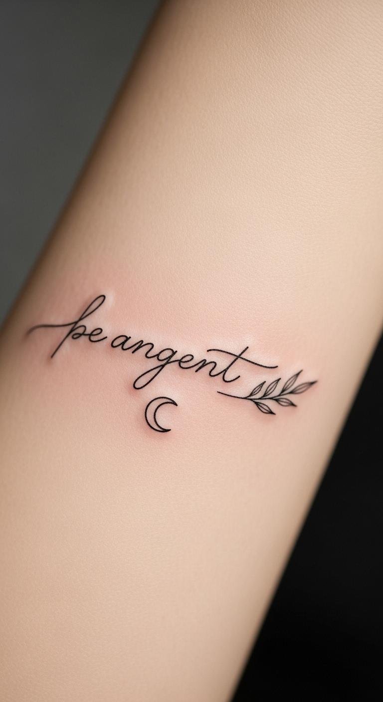 This design blends the elegance of script, the quiet mystery of a crescent moon, and the organic calm of a single botanical sprig to symbolize personal growth, inner light, and resilience.