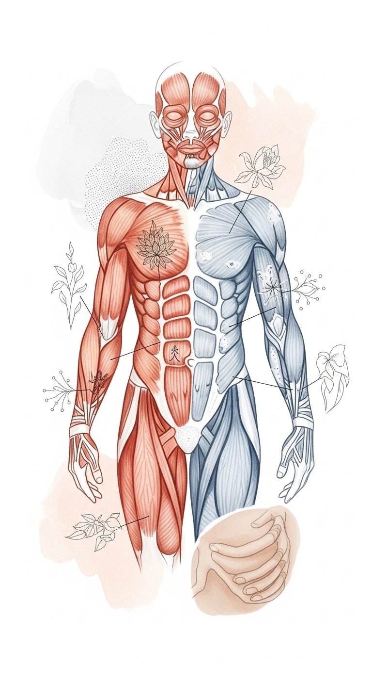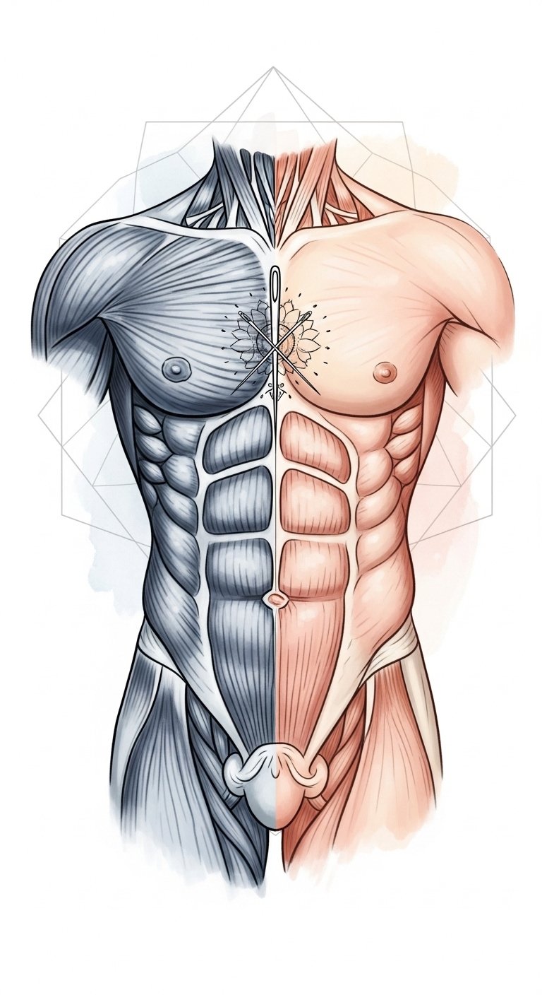 This design symbolizes the interplay between physical form and personal experience—muscle and fat depicted as complementary halves that inform sensation and resilience. The central needle motif represents the tattoo process as a unifying choice, while the grid and watercolor background convey both clinical awareness and emotional fluidity.
