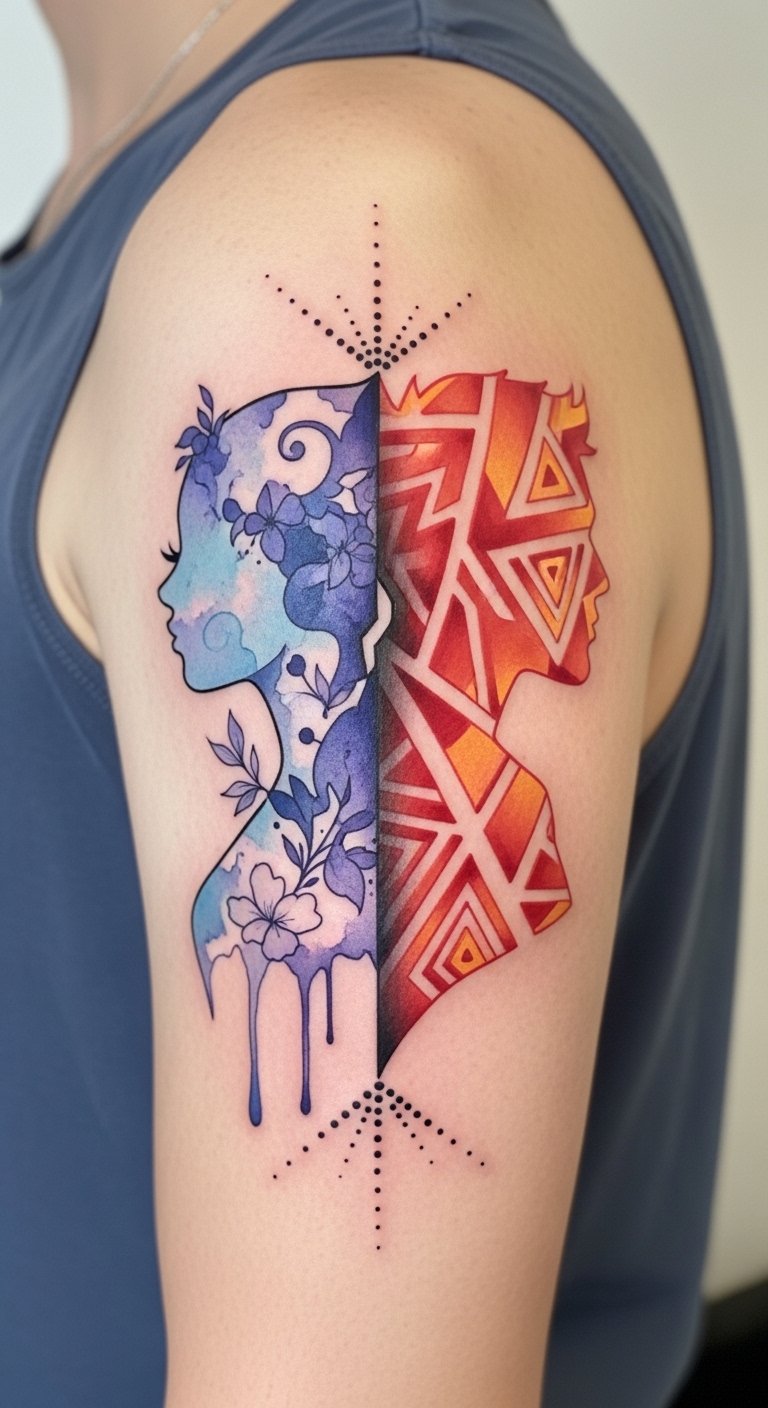 Embrace the journey, knowing that the freedom of self-expression often comes with a touch of pain intensity along the way. This design uses the contrasted warm and cool palette to symbolize comfort versus intensity, with delicate motifs at gentler spots to evoke ease and bolder linework at bony areas to express resilience; ideal placement is on a forearm or shoulder where visibility and lower pain intersect, carrying both meaning and approachable commitment.