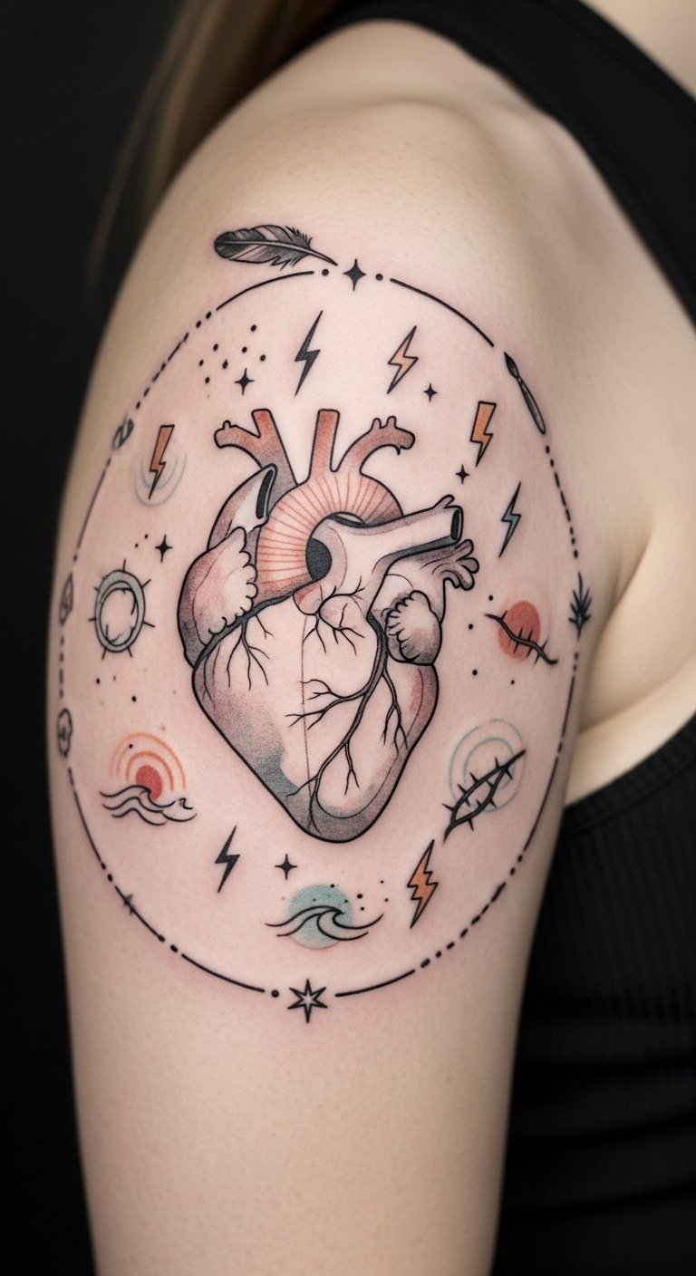 The central watercolor heart symbolizes personal core and vulnerability, the varied pain icons represent individual triggers and their different intensities, and the encircling band with personal symbols denotes protection and chosen expressions of identity; emotionally the piece balances resilience and gentleness, suggesting growth through acceptance.