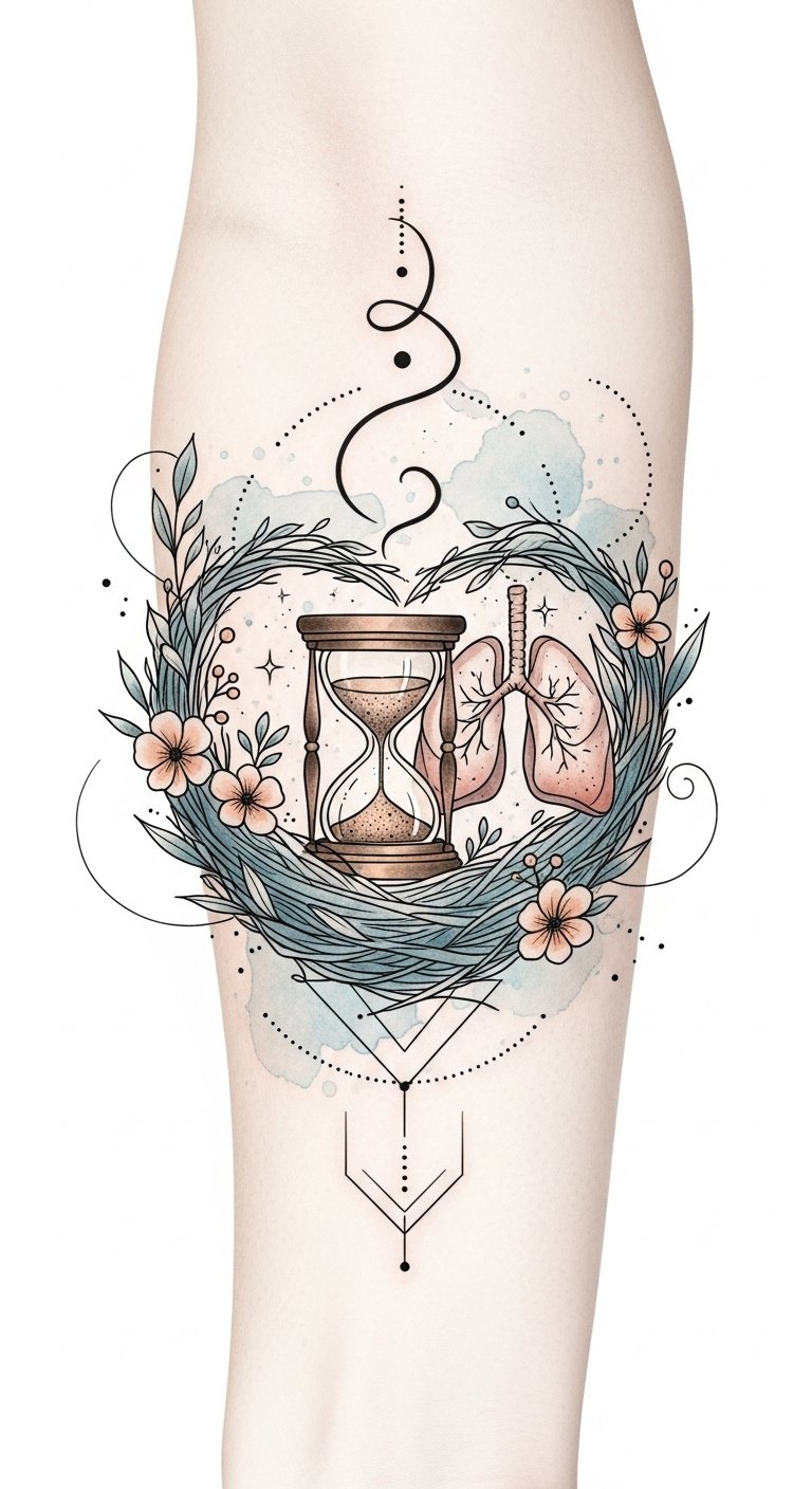 Rendered with watercolor washes and fine line dotwork, the tattoo evokes gentle emotion—comfort, focus, and renewal—suitable for a forearm or over the chest where it can be seen during moments of breathwork and reassurance.