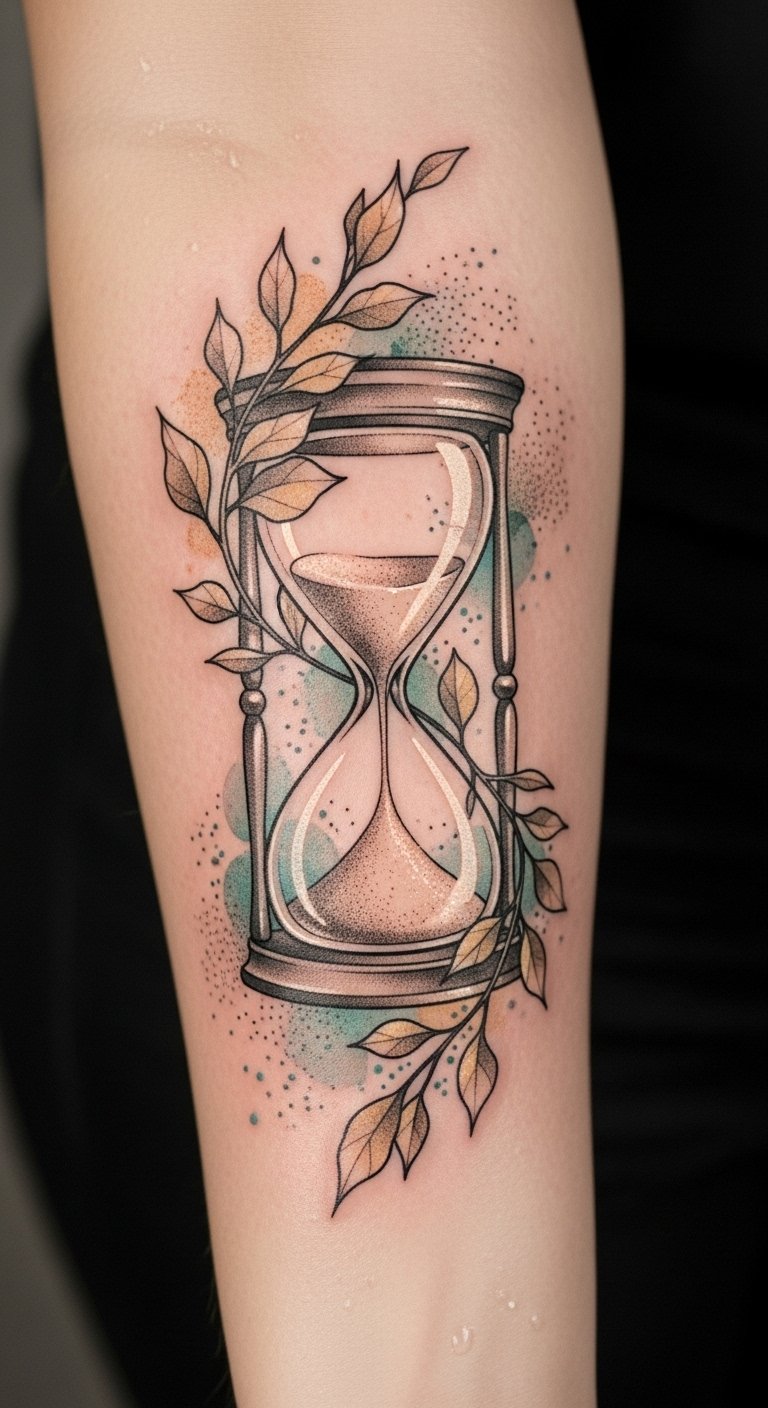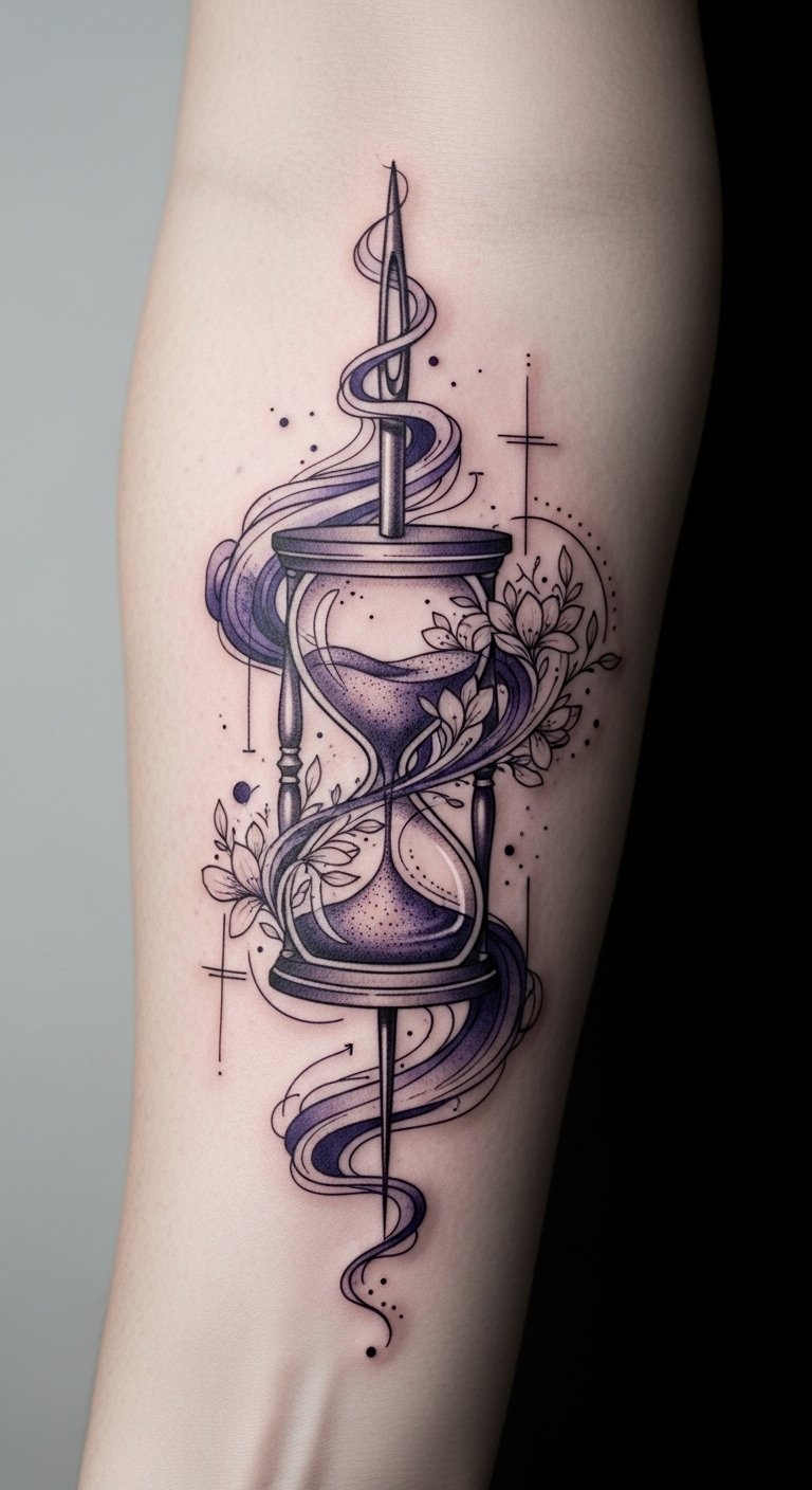 Remember, it’s about the freedom of expression—embracing the journey, even when it gets intense, makes the final masterpiece worth it. This design symbolizes time, endurance, and transformation: the hourglass represents the passage and duration of the session, the needle and flowing ink tie it directly to tattooing, while the sand blossoming into flowers conveys growth and beauty born from discomfort.