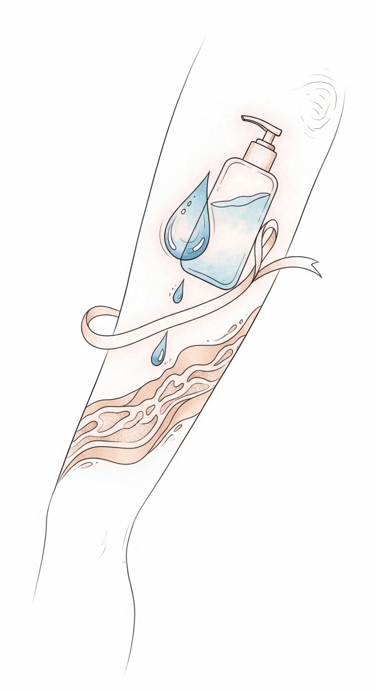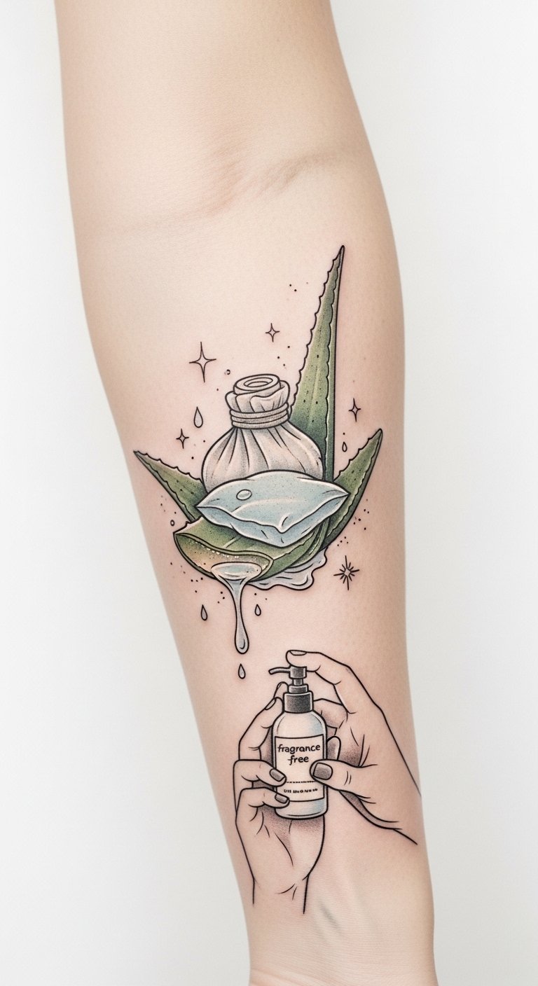 This design symbolizes healing and nurturing: the aloe leaf and cold compress represent soothing care, the lotion bottle and water drops signify hydration and gentle maintenance, and the tiny stars imply recovery and renewed confidence.