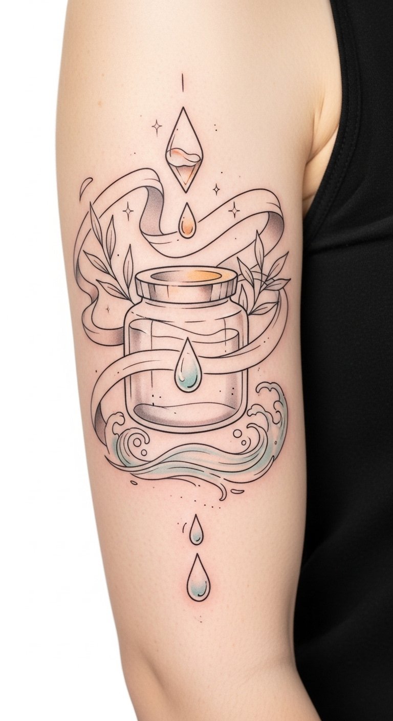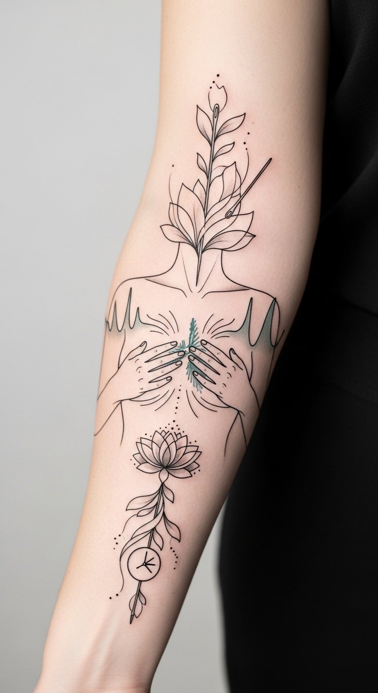 Emotionally it conveys calmness, self-compassion, and mindful ritual. Ideal placement is the inner forearm where visibility supports a reminder to care for the tattoo and skin, sizing allows discretion while offering space for fine details and longevity.