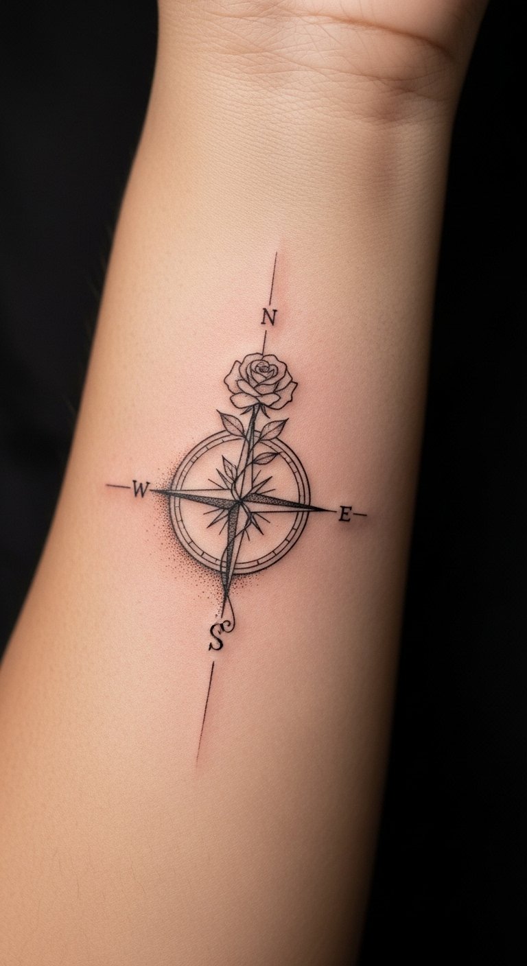 This design echoes the original text’s focus on manageable, visible beginner locations like the forearm and embraces themes of freedom and self-expression; the compass symbolizes guidance and personal direction while the rose represents growth and individuality, creating a balanced emotional resonance of confidence and gentle exploration.