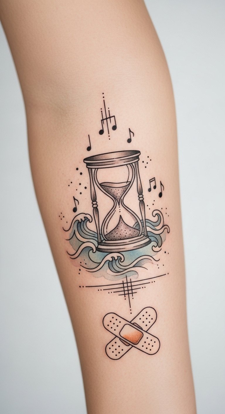 The hourglass symbolizes pacing and the passage of time during a tattoo session, while the soft waves and breath lines represent deep breathing and rhythmic focus that help shift attention from pain; musical notes nod to using music as a distraction, and the minimalist bandage motif acknowledges the care and recovery involved.