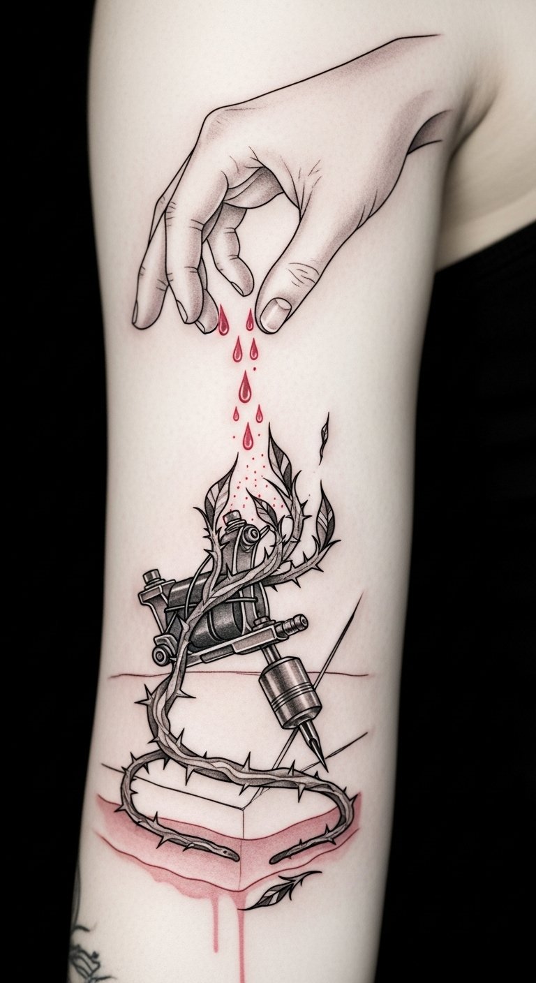 The design symbolizes the interplay between vulnerability and control: the hand signifies personal agency, the red drops that become thorned vines represent how physical reactions (bleeding, sensitivity) transform into the visible story of the tattoo, and the tattoo machine anchors the scene as both tool and catalyst.