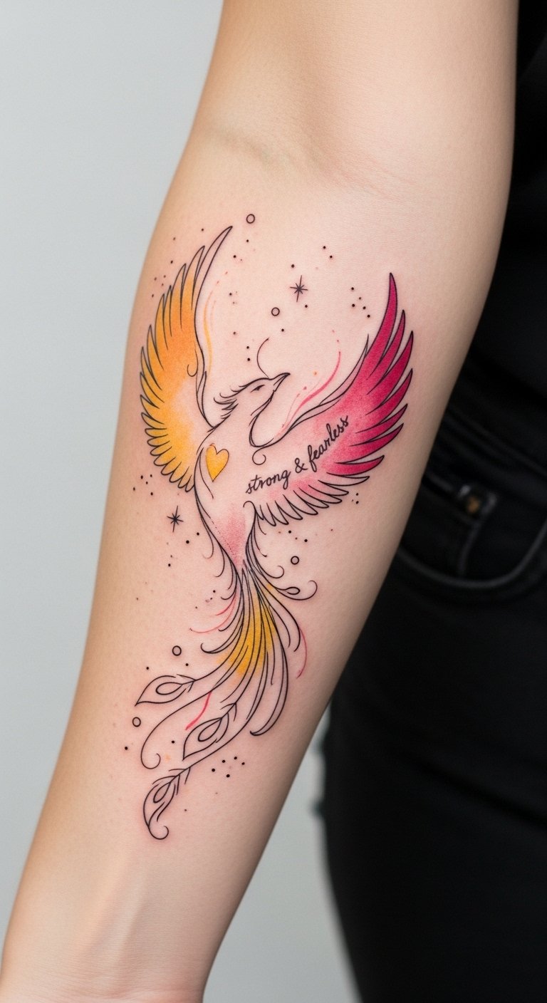 The phoenix symbolizes rebirth and personal strength, echoing the visualization of a beautiful design coming to life on your skin; the delicate linework and watercolor softness reflect calm focus and reduced anxiety, while the embedded script serves as a quiet affirmation to empower the wearer.
