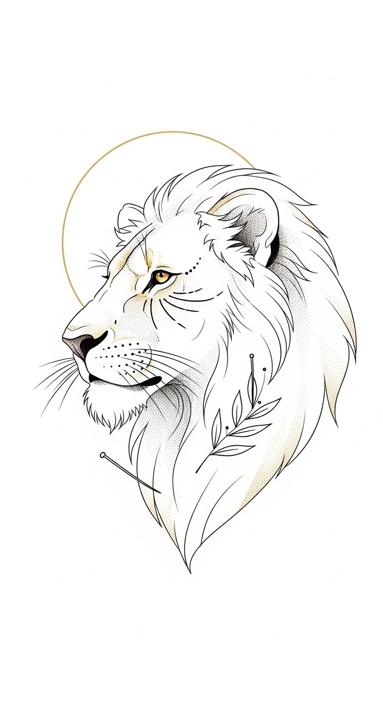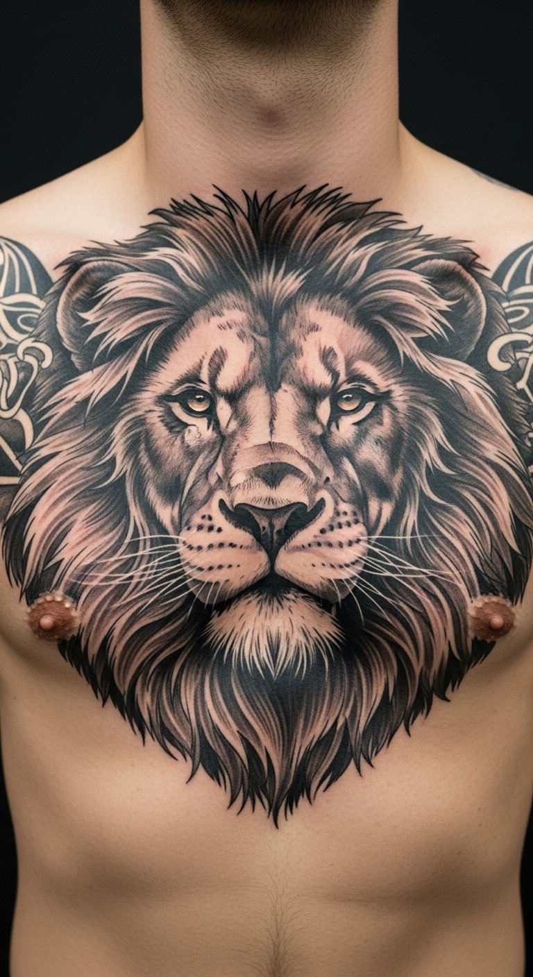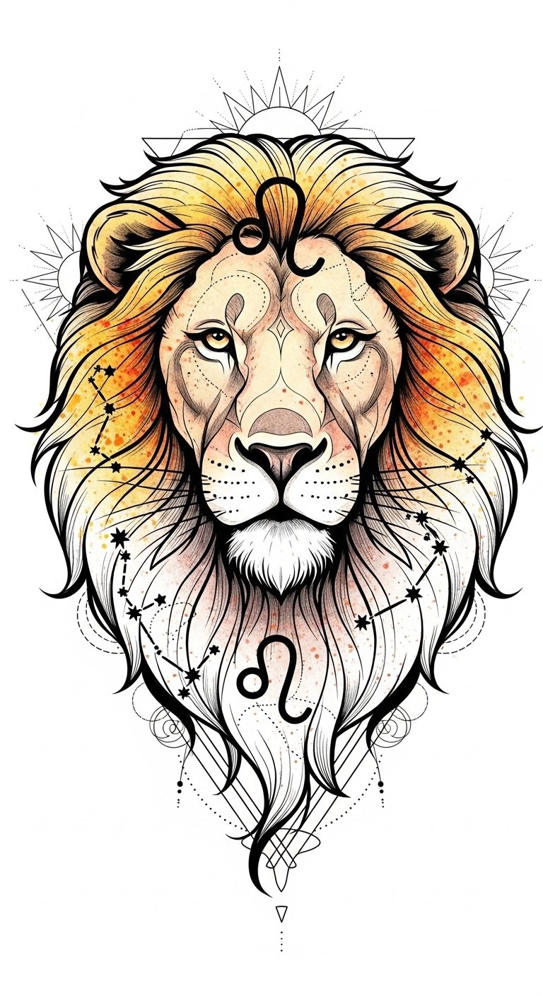 The design evokes pride, warmth, and empowerment—place it on the upper arm, chest, or shoulder to mirror the lion’s protective, prominent nature; small constellation details can wrap toward the collarbone or inner wrist for a personal, intimate touch.