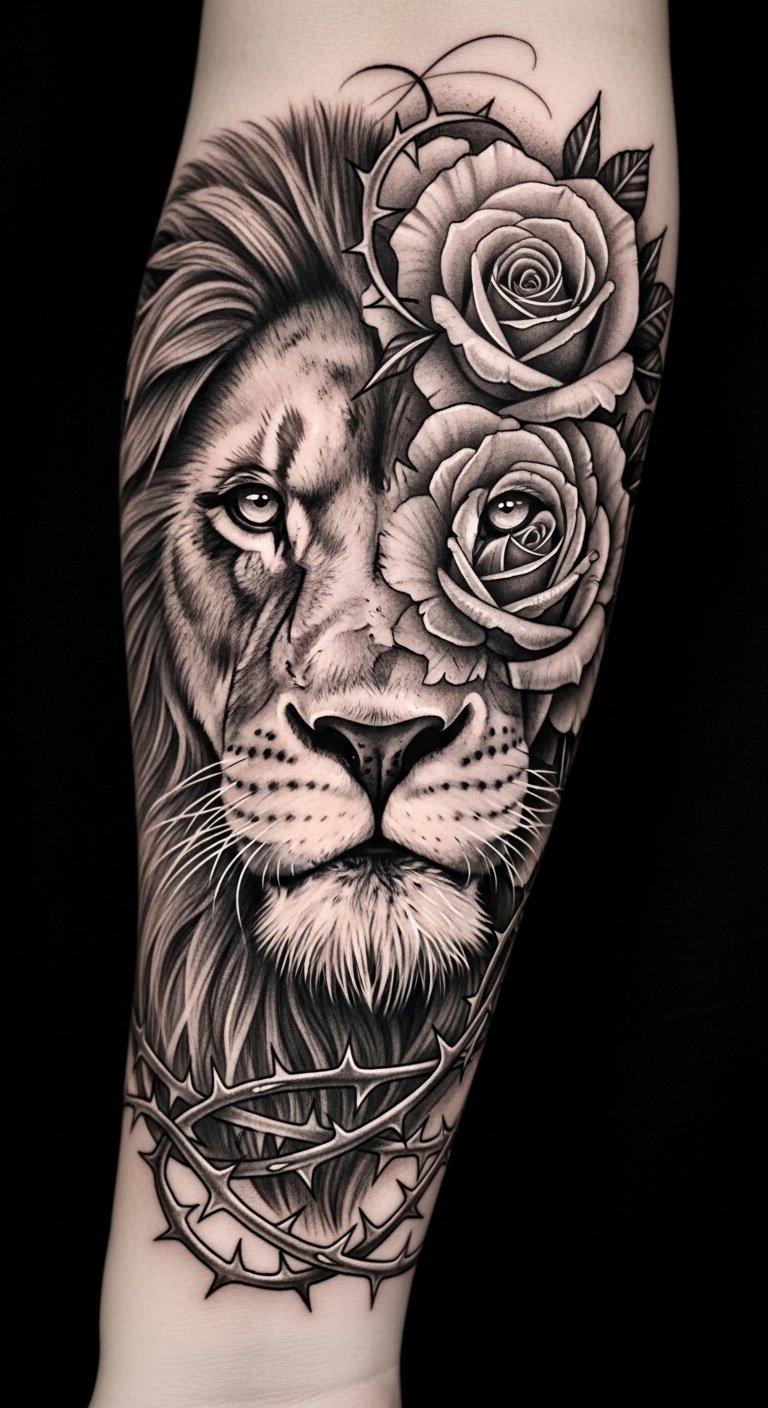 Embrace the lion rose symbolism, and let this ink tell your story of courage and compassion, celebrating life’s dualities.