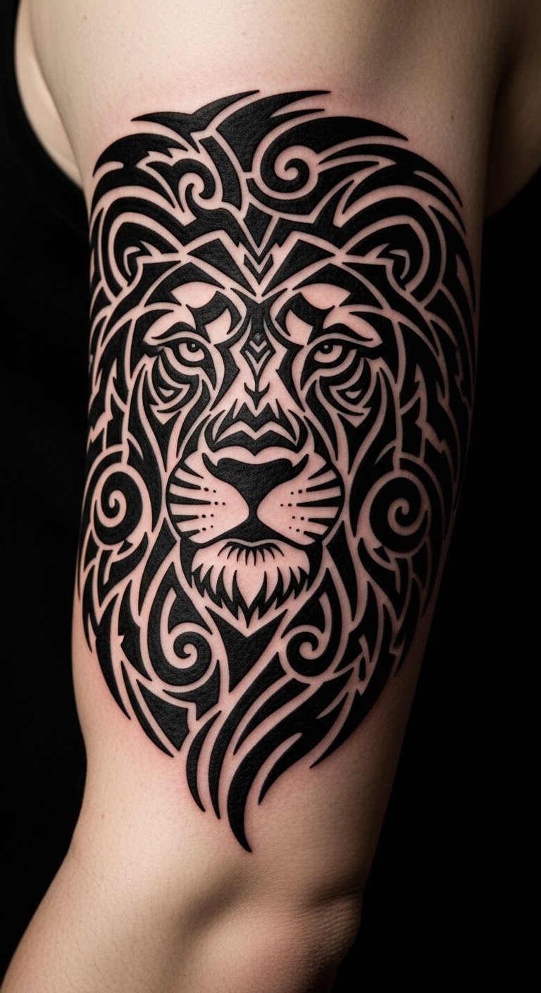 The design combines bold, flowing tribal lines to form a regal lion’s face and mane, using negative space to highlight eyes and jaw; placement over the chest, shoulder, or calf enhances visibility and allows the mane to follow musculature, conveying strength, courage, and leadership. Emotionally, the motif evokes pride and protection while honoring cultural roots—choose ink tones and fine detailing to balance modern aesthetics with traditional symbolism, and plan aftercare to preserve contrast and clarity over time.