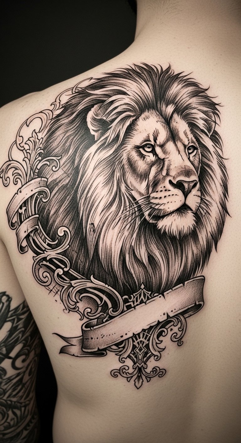 This tattoo concept pairs regal strength and timeless nostalgia: the lion symbolizes courage, leadership, and protective guardianship, while the vintage style evokes memory, heritage, and romantic adventure.