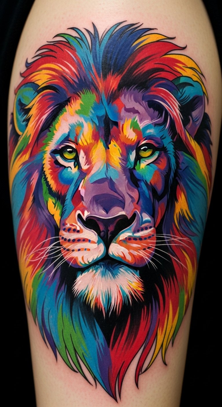 This design uses the original text as a visual and emotional guide: a fierce lion head rendered with a multicolored mane—bright gradients, watercolor splashes, and crisp linework—to convey boldness and vitality. Symbolically the lion represents strength, leadership, and freedom, while the vivid palette reflects individuality, passion, and life’s journey. Ideal placements include the upper arm, chest, or back where scale and flow emphasize the mane; smaller versions suit the forearm or calf to keep the energetic details legible and impactful.