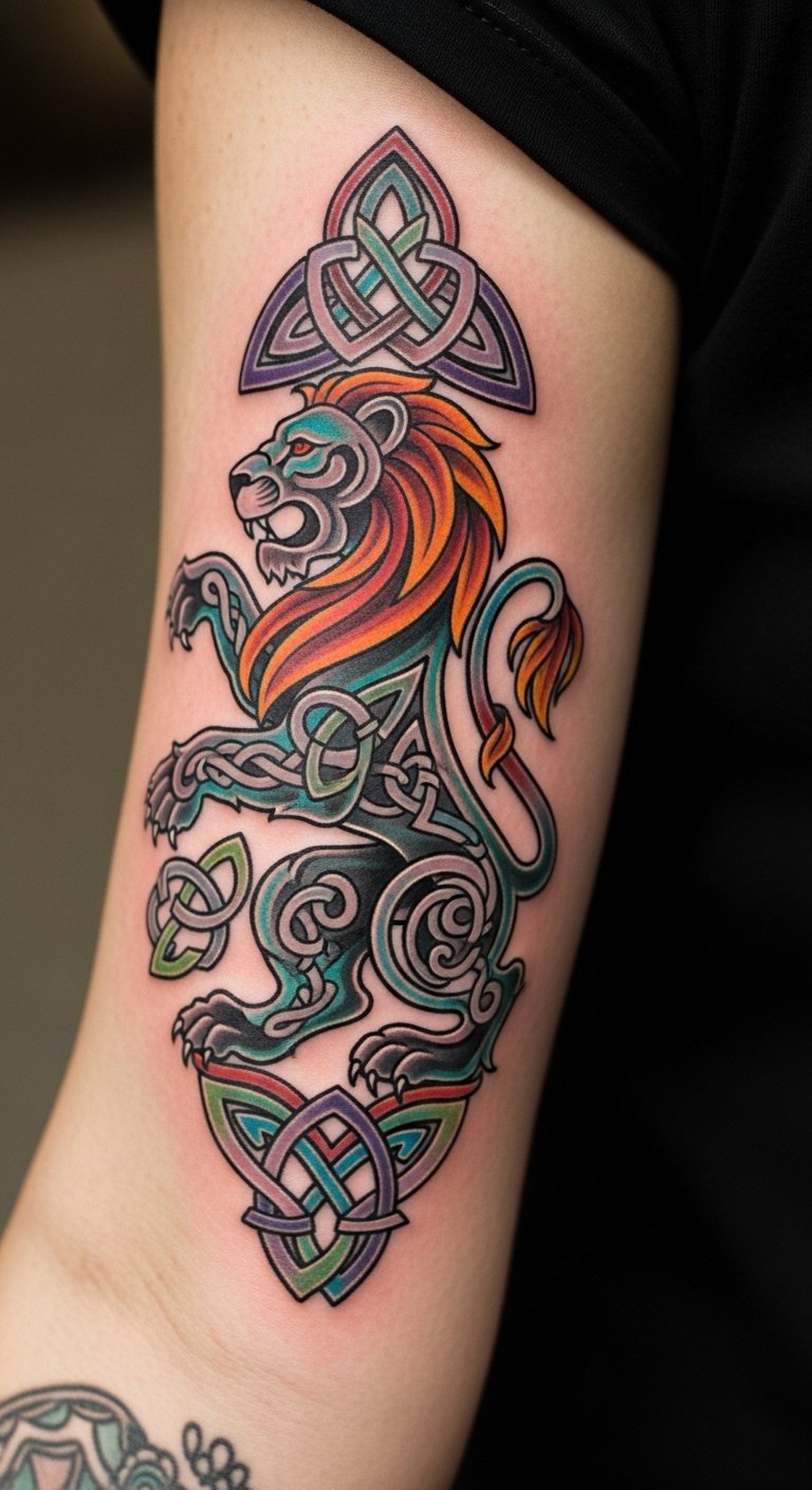 Embodying strength and unity, the Celtic knotted lion tattoo weaves intricate designs that reflect both heritage and symbolism; the intertwining lines suggest an unbroken legacy and protective power, evoking pride and resilience.