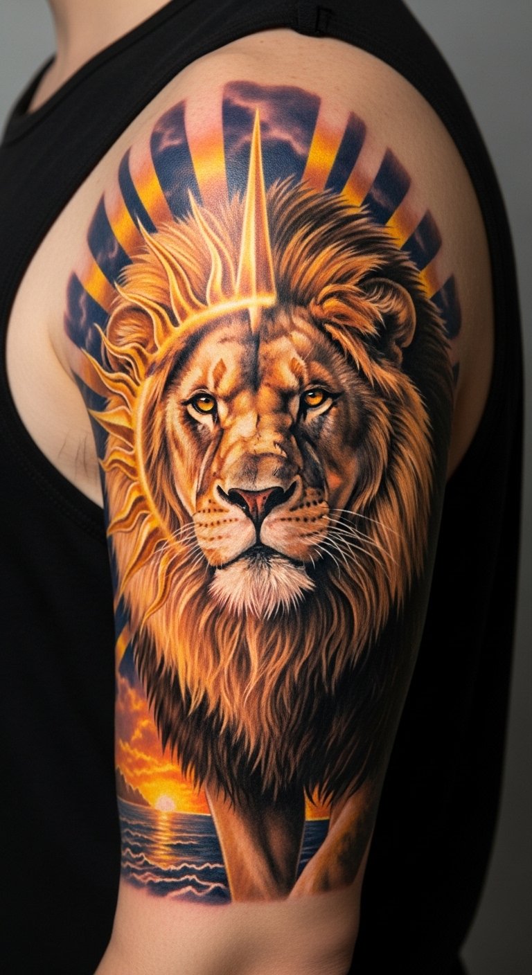This tattoo combines radiant solar imagery with a regal lion, using warm golds and deep ambers for the sun and rich ochres and siennas for the lion, with flowing rays that contour musculature—ideal for a chest, upper back, or shoulder sleeve to emphasize movement and strength.