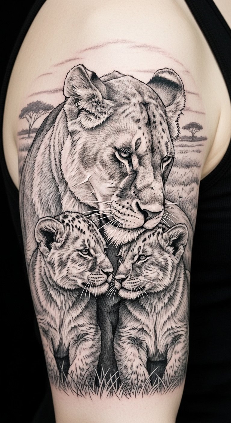 The image of a lioness with her cubs embodies nurturing strength and fierce protection.
