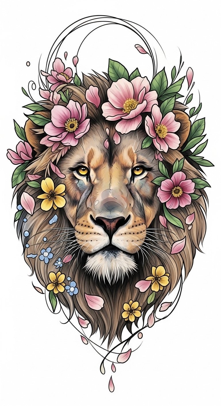 This enchanting floral lion design showcases the raw power of the king of the jungle intertwined with delicate petals, representing love and passion.