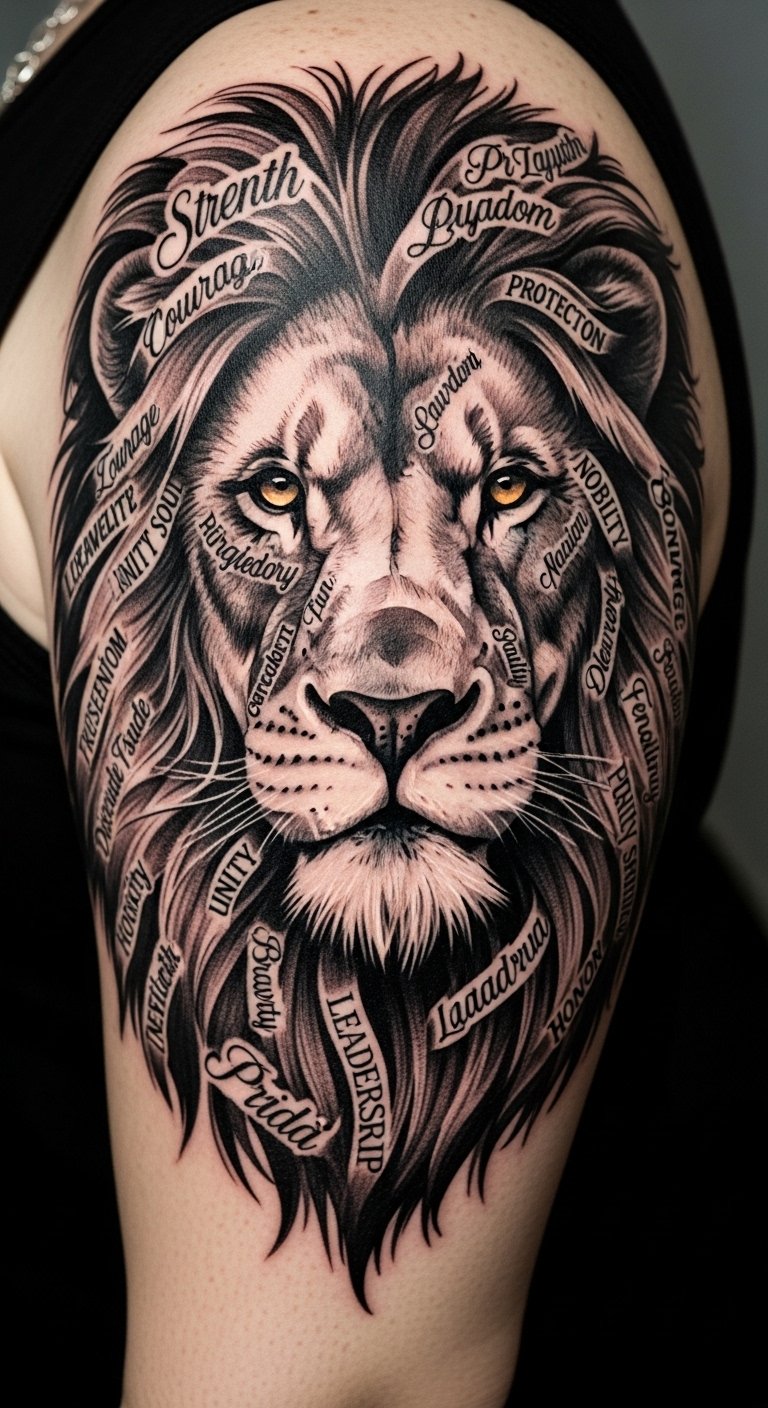 This tattoo concept pairs a realistic lion head rendered in fine black and grey with flowing script of the original text integrated into the mane and surrounding negative space; place on the upper chest, back shoulder, or forearm where the text can curve naturally, allowing the words to become part of the form.
