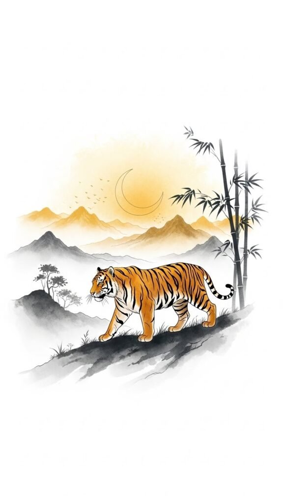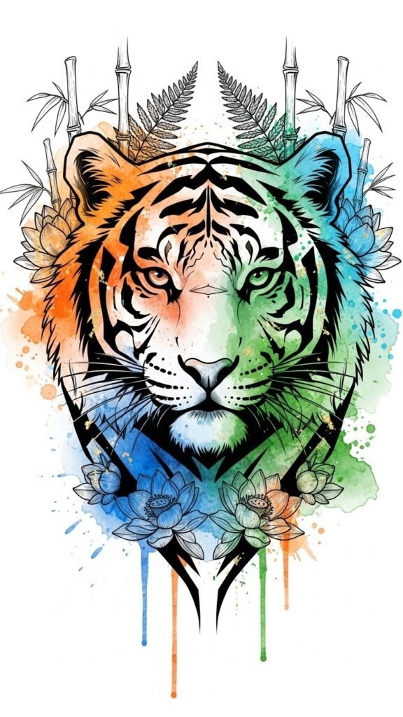 The roaring tiger represents triumph over adversity and inner strength, the bamboo and lotus signify resilience and rebirth; brushstroke accents evoke personal history and cultural artistry, while watercolor washes soften intensity into spiritual connection.