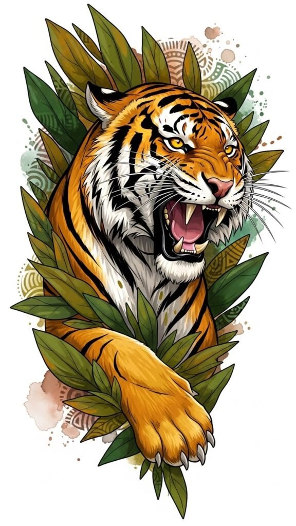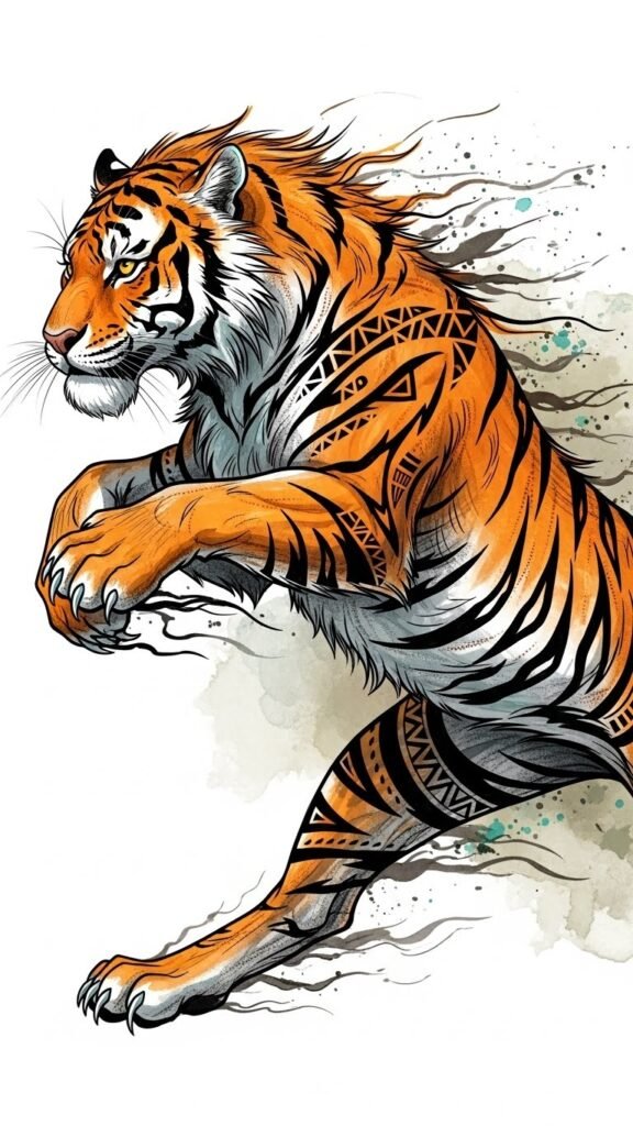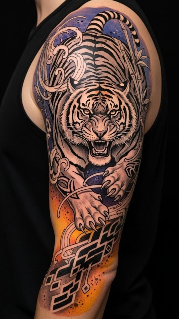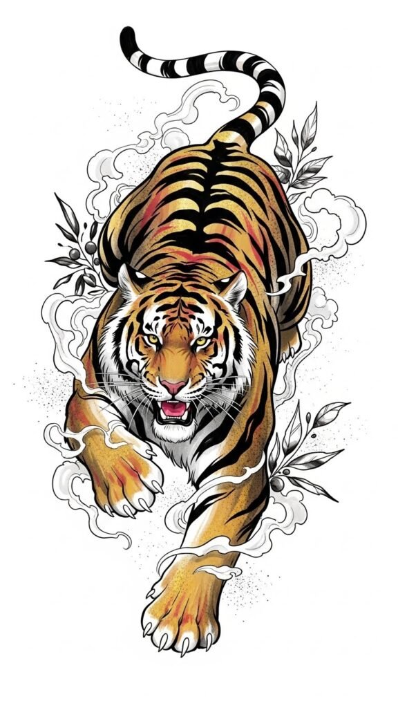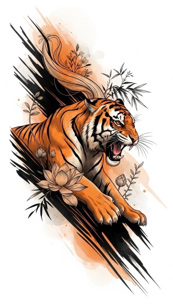 Ideal placements are the upper arm, shoulder blade, or chest where the tiger’s forward motion can follow the body’s natural lines; shading and negative-space elements allow the piece to age gracefully and integrate with existing tattoos.