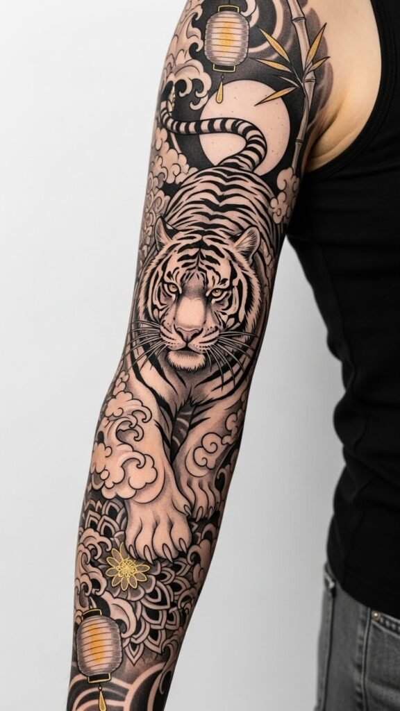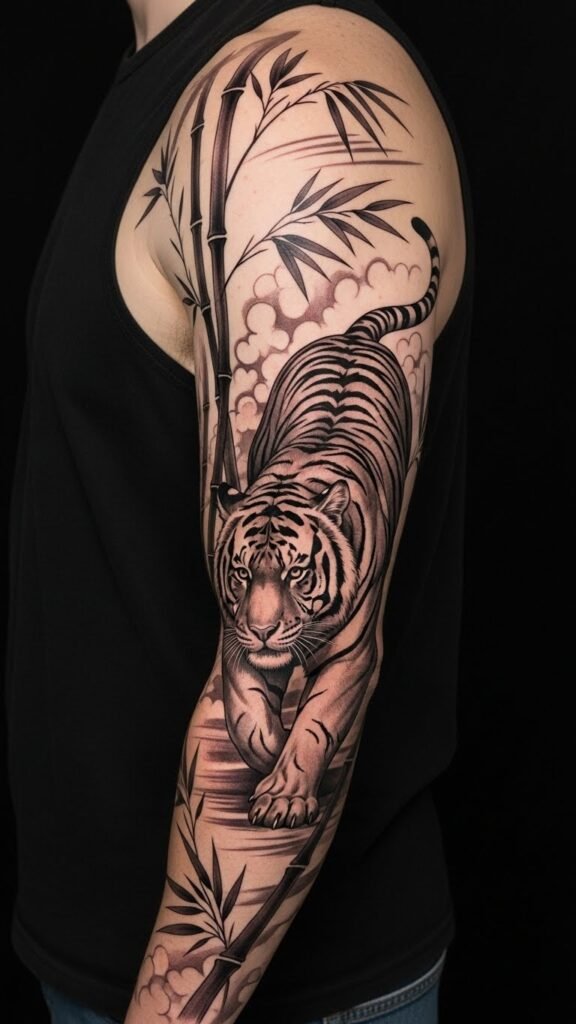 Ideal placement is a half-sleeve wrapping the upper arm or a side rib piece where the bamboo stalks can flow with natural body lines, allowing the tiger’s gaze to align with the wearer’s posture and create movement as they turn.
