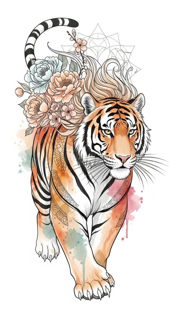 The combined imagery of the tiger and flowers balances power with grace, evoking protective ferocity tempered by softness; watercolor tones add emotional warmth while filigree and mandala elements suggest harmony and spiritual grounding.