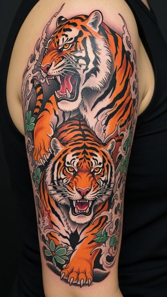 With vibrant colors and intricate design techniques, these tattoos blend tiger symbolism with nature motifs, reflecting personal stories and cultural fusion.