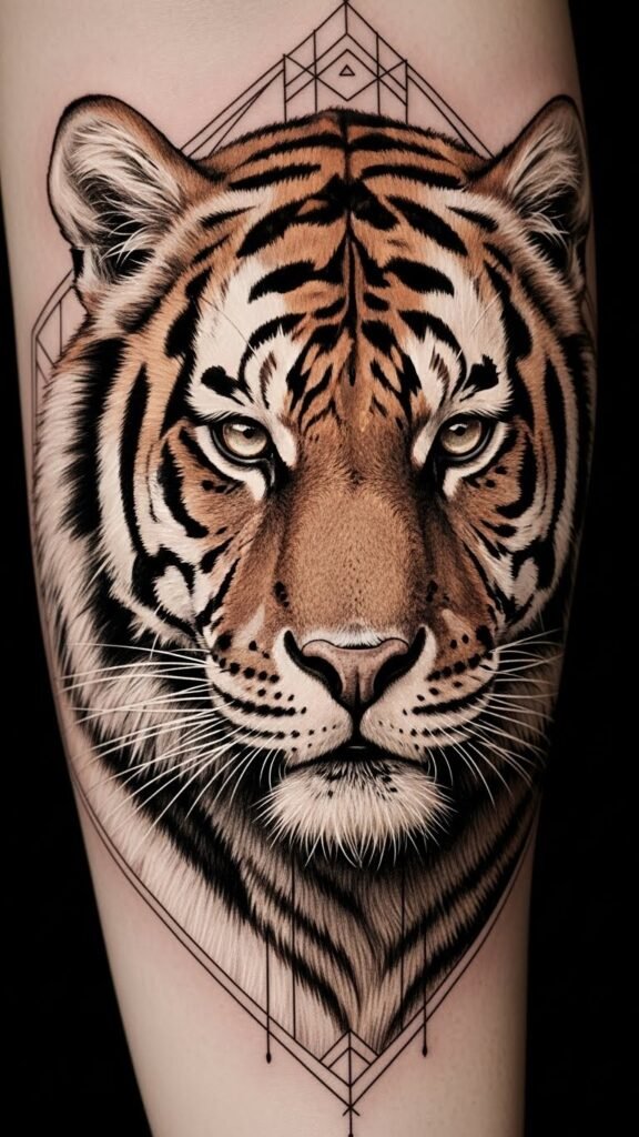 The design centers on the tiger’s eyes as the focal point to convey authority and inner resolve; surrounding fine-line geometric framing adds modern structure that echoes personal discipline, while the hyperrealistic fur and high-contrast shading evoke strength and resilience.